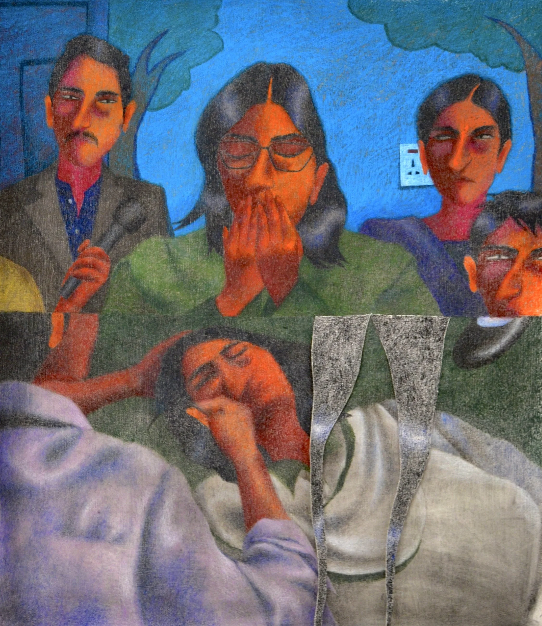 Colour pencil, chalk pastel, graphite, collage on canvas, 23x26