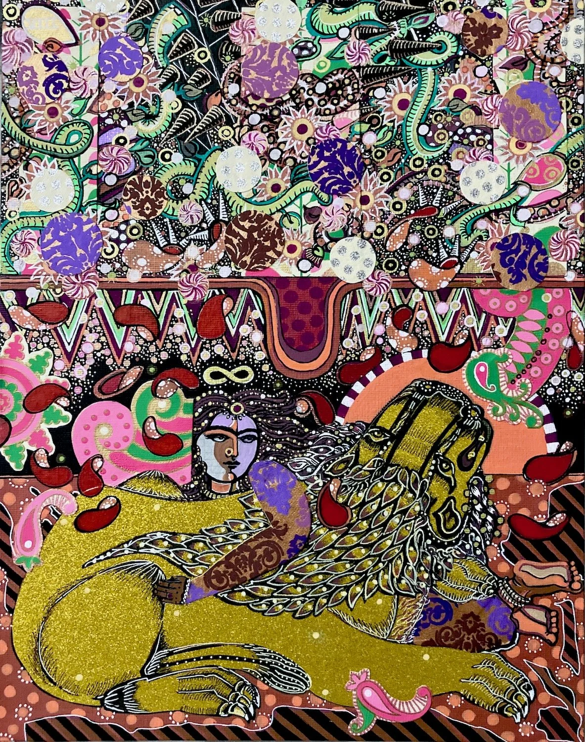 Tazeen Fatima is a visual artist based in Lahore, Pakistan. She graduated from the National college of Arts, Lahore in 2024. Her work explores the delicate balance between masculine and feminine energies, with a particular focus on the emotional consequences of their imbalance in both individuals and society. By engaging with this theme, she seeks to challenge traditional gender roles and prompt a conversation about personal and collective wellbeing. Her intensely expressive canvases are awash in aesthetics, architectural styles and landscapes that are distinctly tropical modernist and essentially South Asian. Her practice has been shaped through residencies at Muse Gallery and Articulate Residency, and her work was recently showcased in a group exhibition at VM Art Gallery, Karachi. Tazeen is making her international debut in Ways of Being.