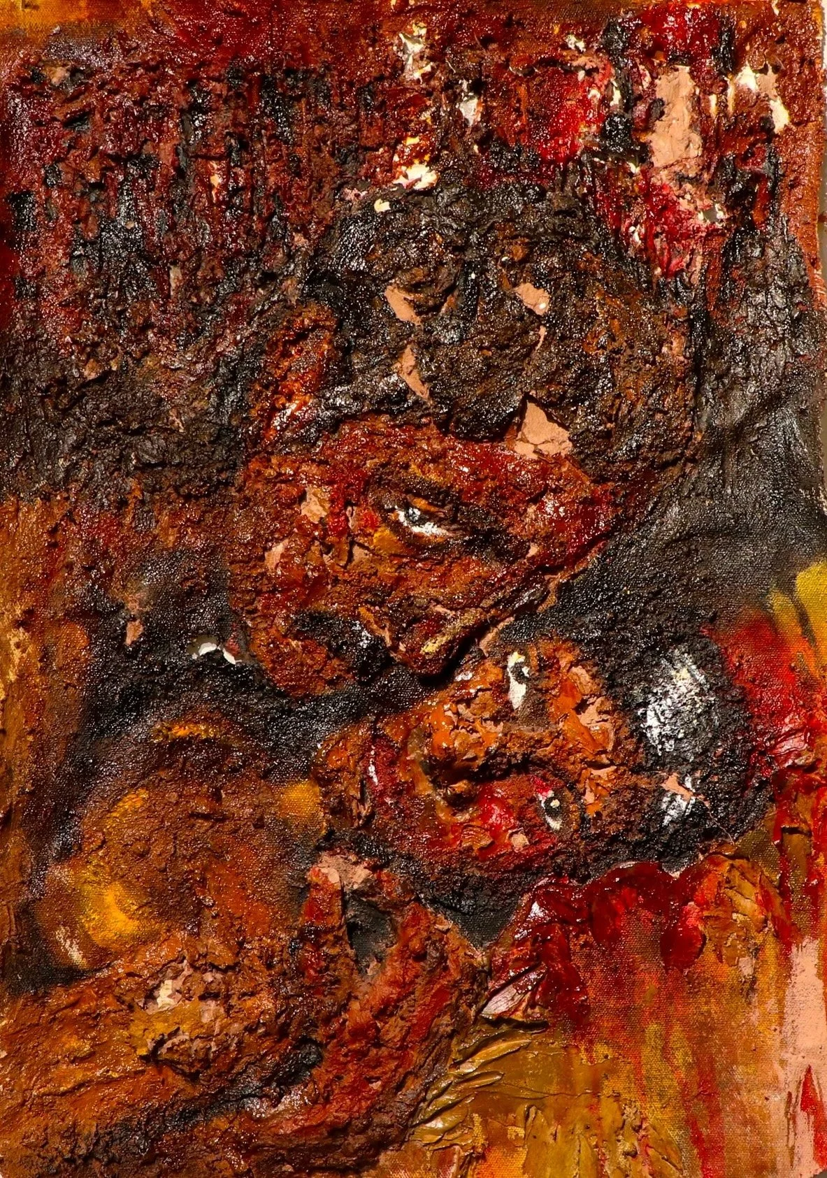 Oil, acrylic, terracotta, PVA, plaster on canvas