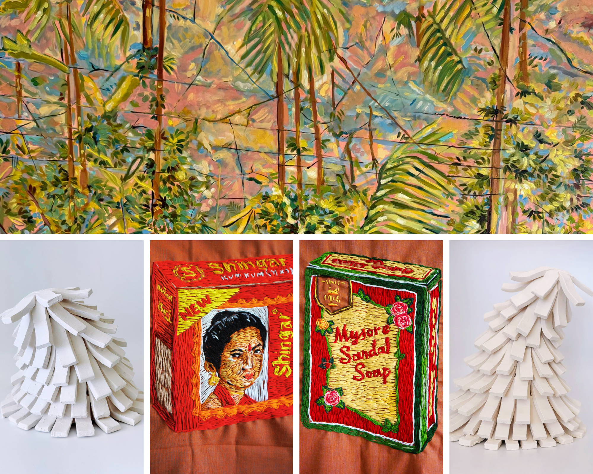 The artists are equally concerned with the present. Far from nostalgic reminiscence or memorialisation, theirs is an act of creation. Pixel and Par use colour with purposeful joy, innovating with form, pattern and texture, sometimes incorporating specific cultural symbols, while often resisting such associations. As they feel out tensions inherent in the idea of home - belonging/separation : comfort/confinement, their work becomes immediately relevant, even urgent, within their shared context as Toronto-based diaspora artists today.
